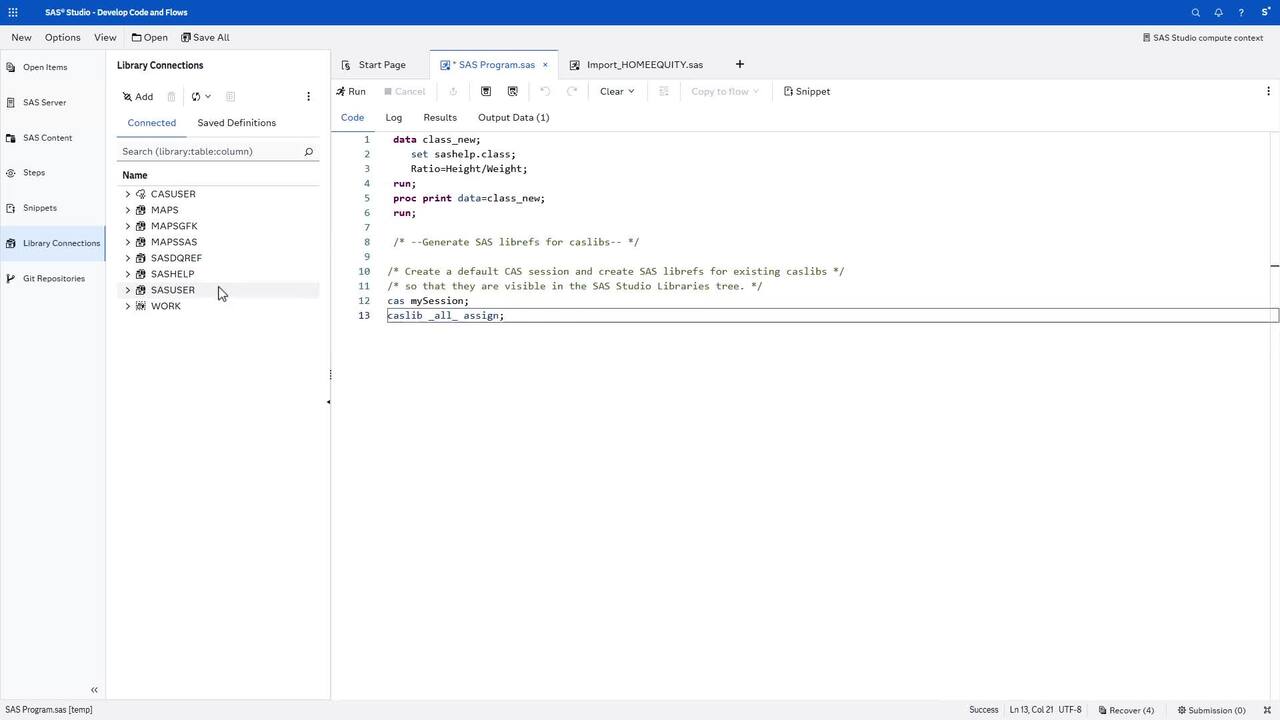 This Quick Start tutorial shows you how to develop SAS code using SAS Studio. Explore the helpful features in the SAS Studio program editor, including the DATA step debugger, code snippets, background submission, and program scheduler